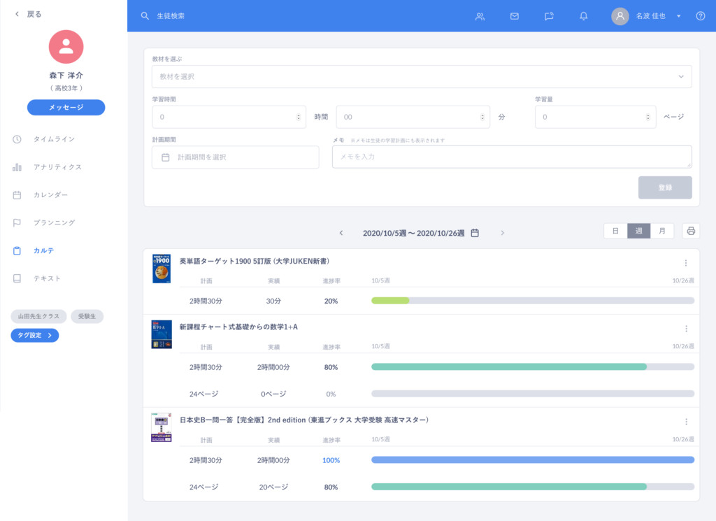 生徒が日々の学習内容を記録し、それを確認・フィードバックできるプラットフォームになっています。