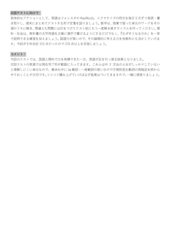 宿題を毎週しっかりできる子は、やはり成績がしっかり上がっていきます。